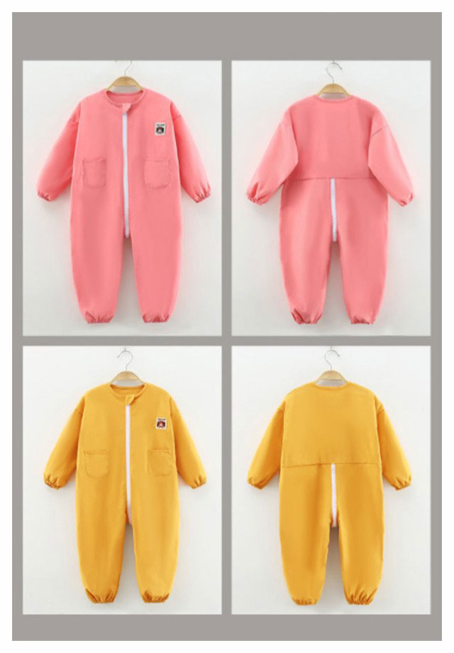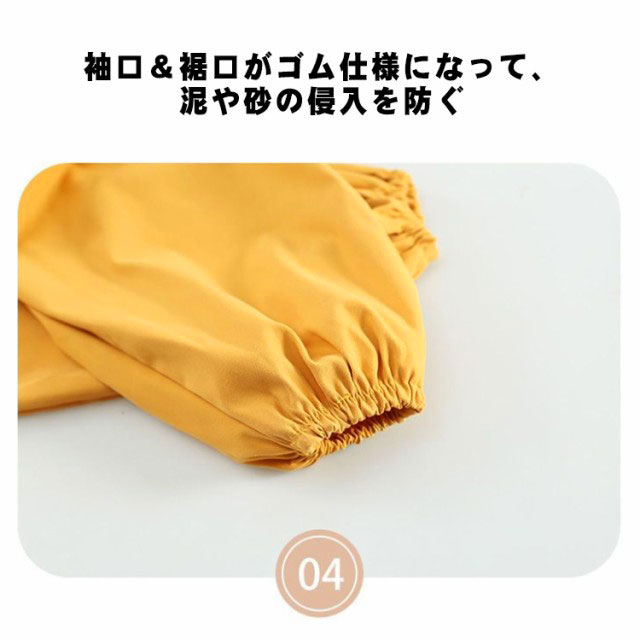 | お洋服の汚れを気にせずたくさん遊べるオーバーオールタイププレイウェア。 袖口&裾口がゴム仕様になって、泥や砂の侵入を防ぐ。 水を弾きやすく、汚れも付きにくい撥水加工生地を使用し、砂場遊び、泥遊び、水遊びなど時、お洋服を砂・土・水滴から守ります。 ゆったりルーズなシルエット、全身を覆うタイプなので、洋服の上から着用するだけで、お洋服を水濡れ・汚れからしっかり守るから、食事、お絵描きはもちろん、泥や砂場、水遊びシーンにも活躍間違いなし。 ご自宅で丸いできるから、いつでもきれいに使えます♪ | |