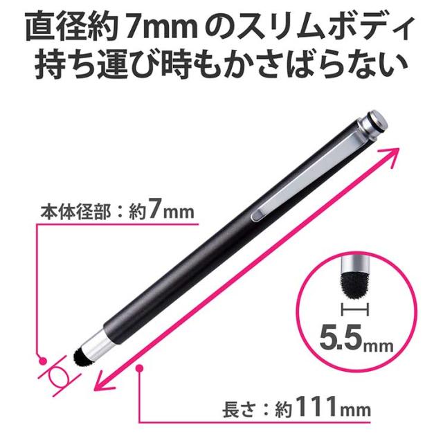 説明:ガラスフィルムでも軽いタッチでしっかりと反応する超感度スマートフォン・タブレット用スリムタッチペンです。高密度ファイバーチップを採用し、ペン先を押し当てることなく軽い力で操作が可能です。ペン先の直径が約5.5mmなので細かい操作も快適。保管時のペン先への不要な摩擦やホコリの侵入などのダメージを防ぐキャップ付きです。■対応機種:各種スマートフォン・タブレット ※特定のアプリやソフトにおいて、専用タッチペンのみでの描写設定をしている場合は使用できないことがあります。 ■外形寸法:長さ約111mm×ペン径約7mm、ペン先約5.5mm ■材質:ペン先:シリコン、ナイロン繊維、本体:アルミニウム ■カラー:ブラック