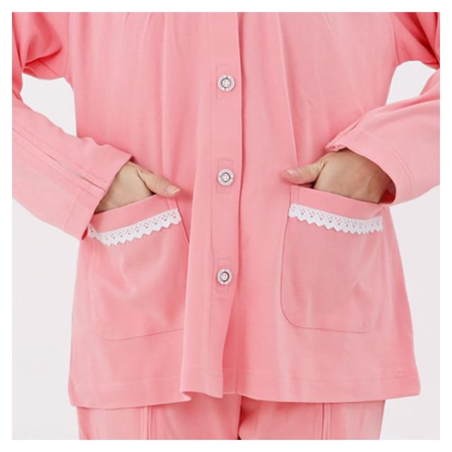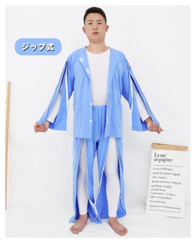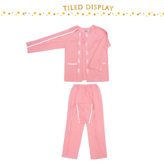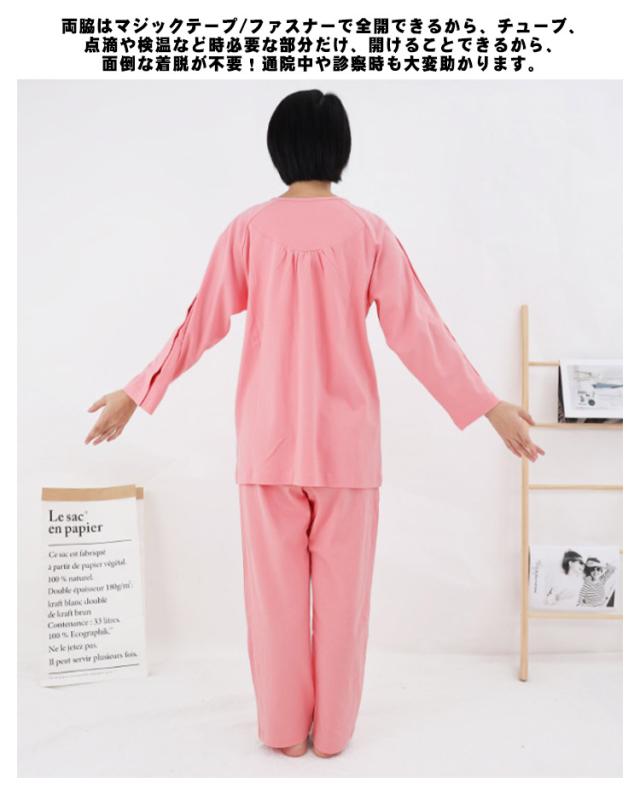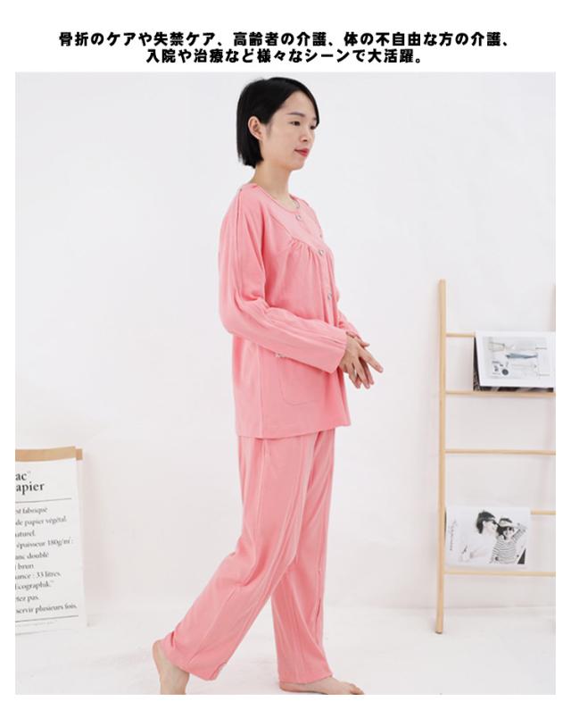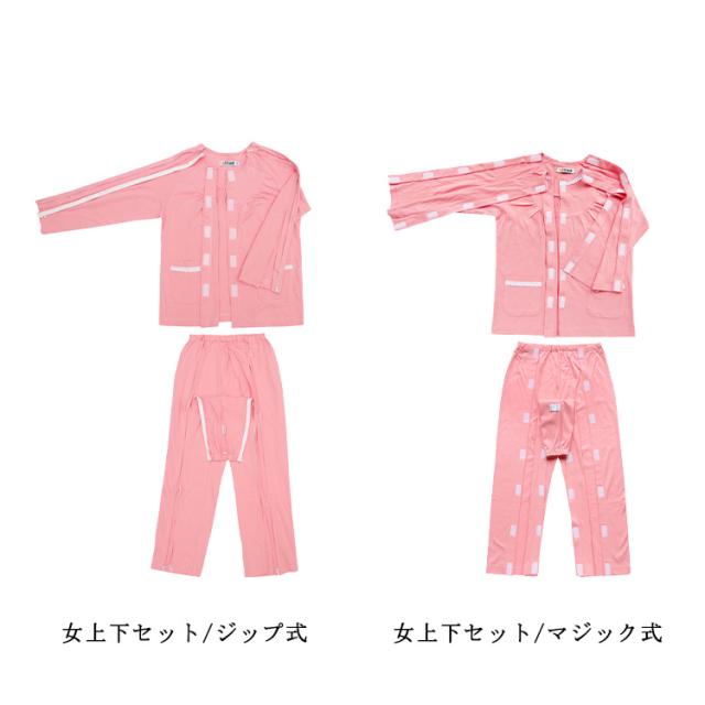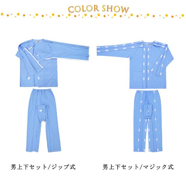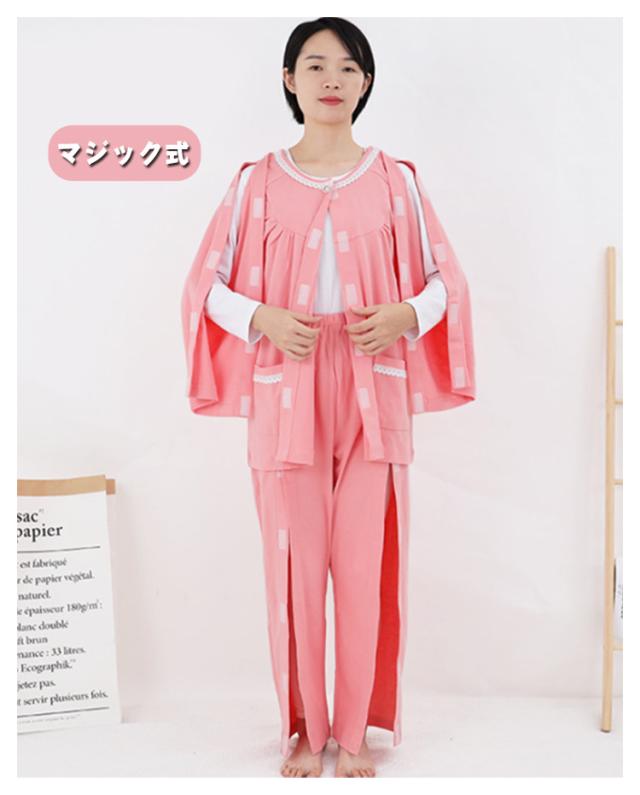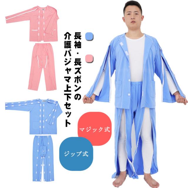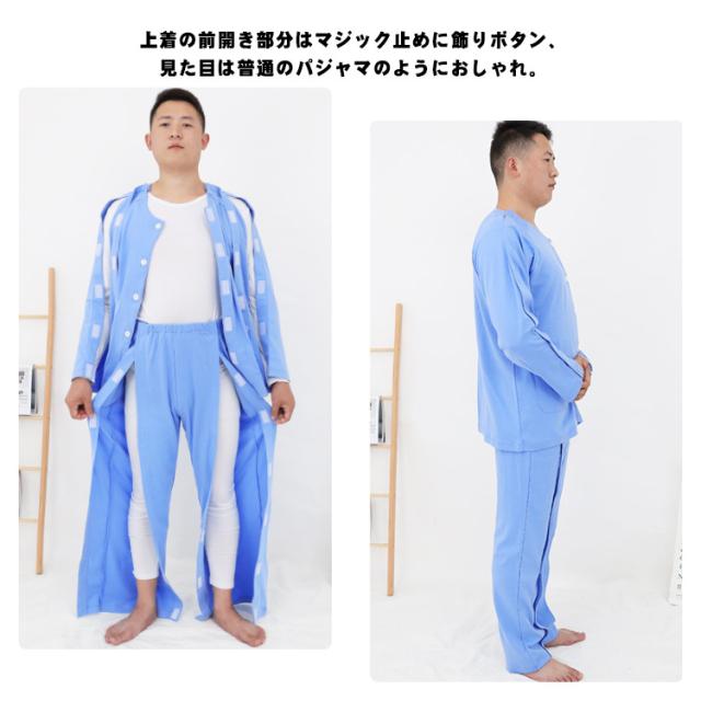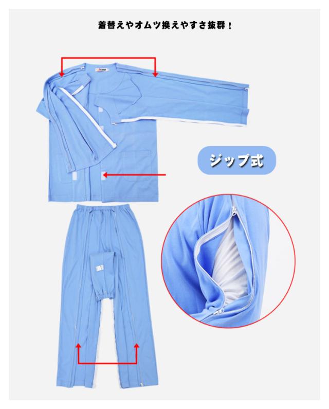 | 着替えやオムツ換えやすさ抜群! 長袖・長ズボンの介護パジャマ上下セット。 肌触り優しい綿素材、オールシーズンご利用いただけます。 上着の前開き部分はマジック止めに飾りボタン、見た目は普通のパジャマのようにおしゃれ。両脇はマジックテープ/ファスナーで全開できるから、チューブ、点滴や検温など時必要な部分だけ、開けることできるから、面倒な着脱が不要!通院中や診察時も大変助かります。 骨折のケアや失禁ケア、高齢者の介護、体の不自由な方の介護、入院や治療など様々なシーンで大活躍。 | |
