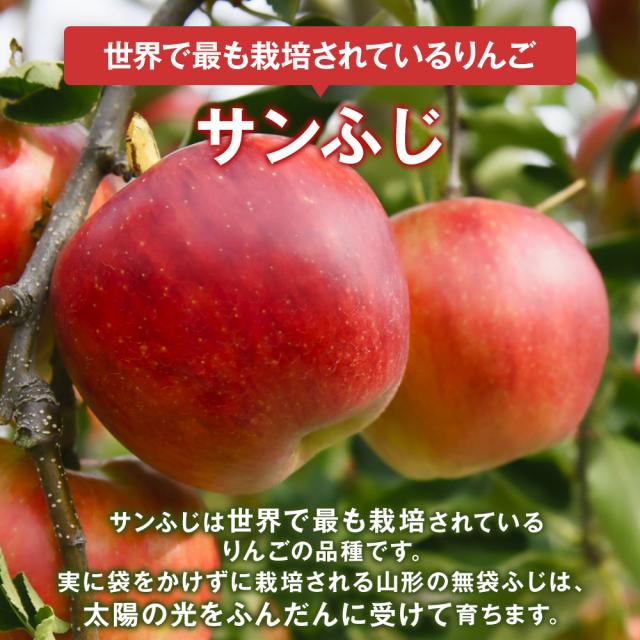 サンふじは、もはや世界でいちばん多く栽培されているリンゴの品種。日本人なら誰でも知っているりんごで名実ともにNO.1の品種です。実に袋をかけずに栽培される山形の無袋ふじは、太陽の光をふんだんに受けて育ちます。果肉の中には、完熟の証であるアメ色の蜜がたっぷり!さわやかな酸味と甘味のバランスが絶妙です。サンふじの「サン」は太陽のこと。太陽の光をたっぷり浴びた品種です。 その味わいは、ひとことでいうと果汁もたっぷりでジューシー。甘味と香り もしっかりとしています。歯触りもシャキシャキと心地いいのが特徴です。特に果肉の中にアメ色の蜜がたっぷり入った山形県産「サンふじ」の美味しさは全国でも評判です。また、山形の地の利といえる朝夕の厳しい冷え込みが生み出す環境「昼と夜の温度差があるから美味しく育つ」のが大きな魅力になります。山間部の温度格差の大きい山形県の自然条件も朝夕の独特の冷え込みによるところが実は大きいことも確かです。