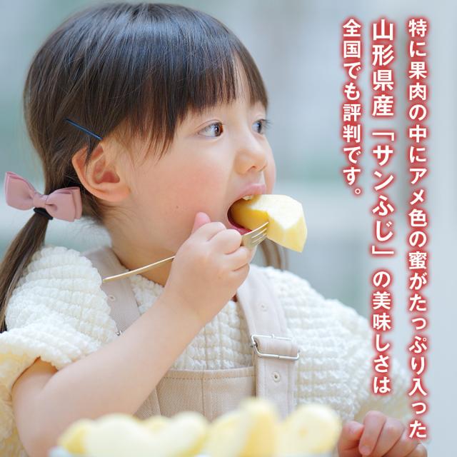 サンふじの「サン」は太陽のこと。太陽の光をたっぷり浴びた品種です。 その味わいは、ひとことでいうと果汁もたっぷりでジューシー。甘味と香り もしっかりとしています。歯触りもシャキシャキと心地いいのが特徴です。特に果肉の中にアメ色の蜜がたっぷり入った山形県産「サンふじ」の美味しさは全国でも評判です。