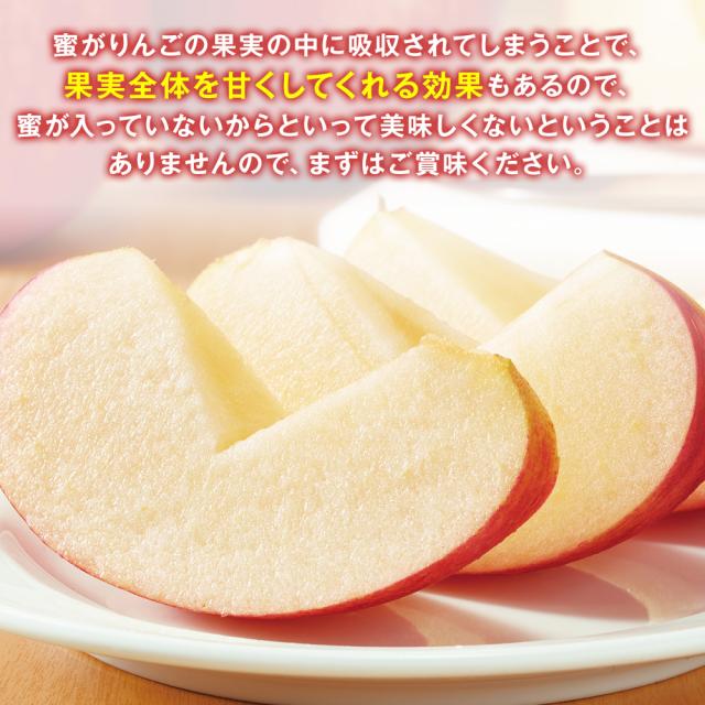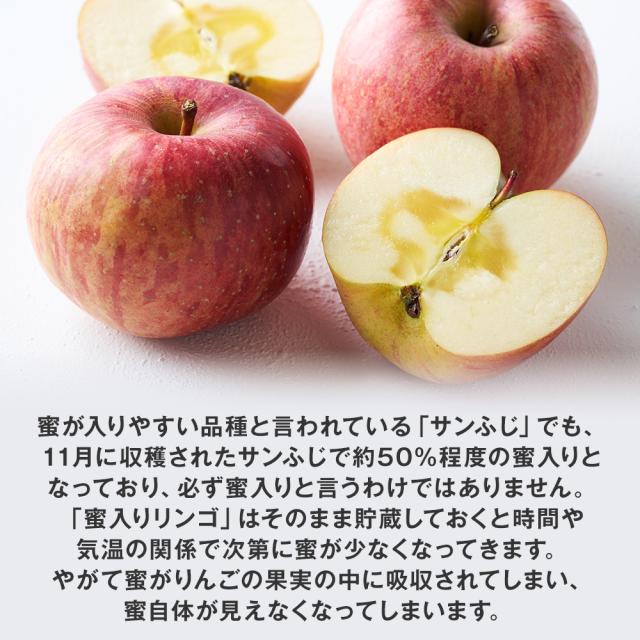 蜜が入りやすい品種と言われている「サンふじ」でも、11月に収穫されたサンふじで約50%程度の蜜入りとなっており、必ず蜜入りと言うわけではありません。 また「蜜入りリンゴ」はそのまま貯蔵しておくと時間や気温の関係で次第に蜜が少なくなってきます。やがて蜜がりんごの果実の中に吸収されてしまい、蜜自体が見えなくなってしまいます。しかし、果実全体を甘くしてくれる効果もあるので、蜜が入っていないからといって美味しくないということはありませんので、まずはご賞味ください。