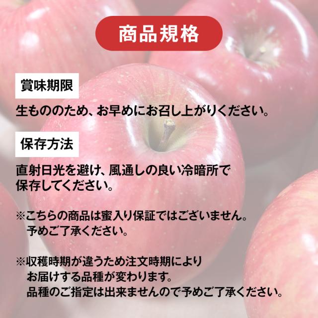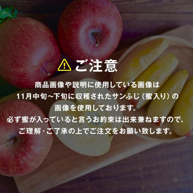 商品画像や説明に使用している画像は11月中旬〜下旬に収穫されたサンふじ(蜜入り)の画像を使用しております。必ず蜜が入っていると言うお約束は出来兼ねますので、ご理解・ご了承の上でご注文をお願い致します。
