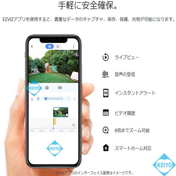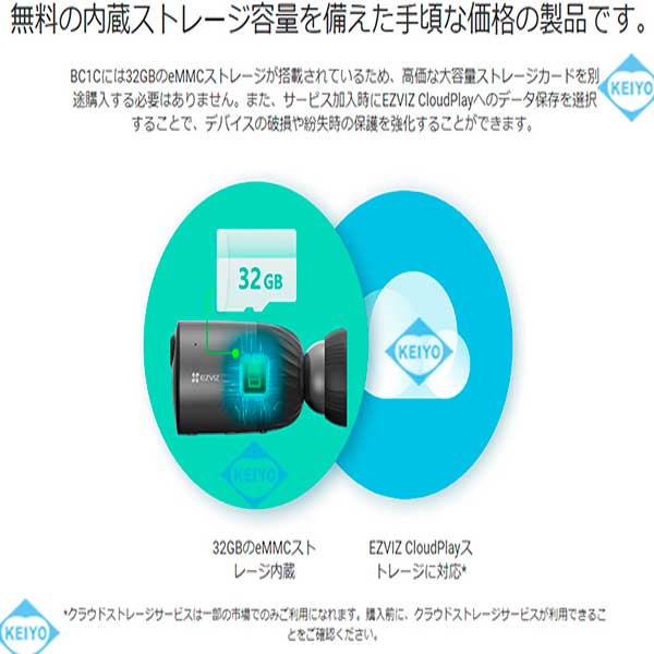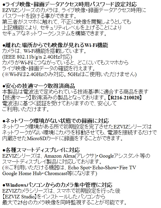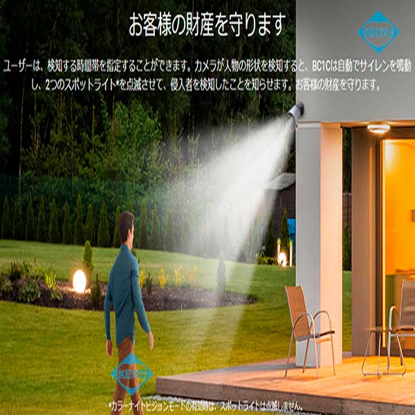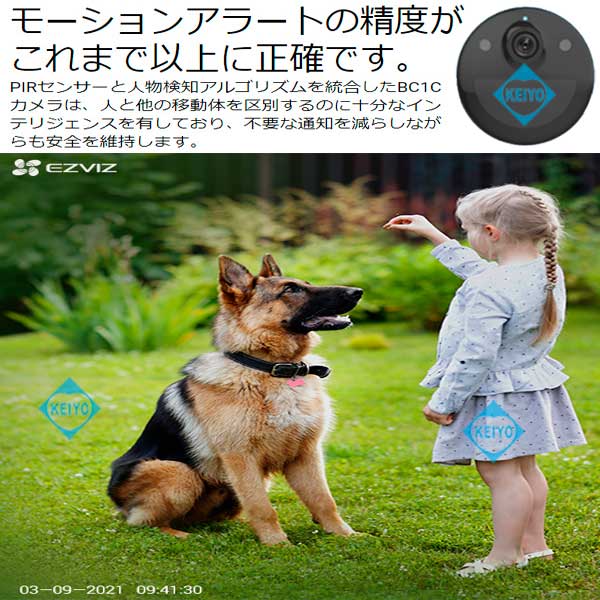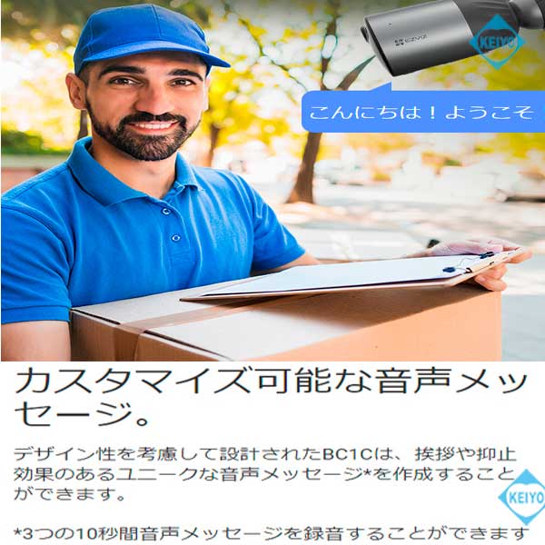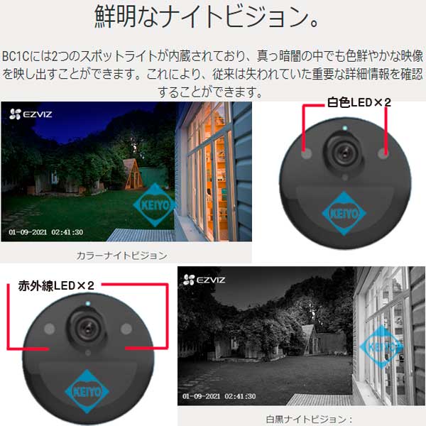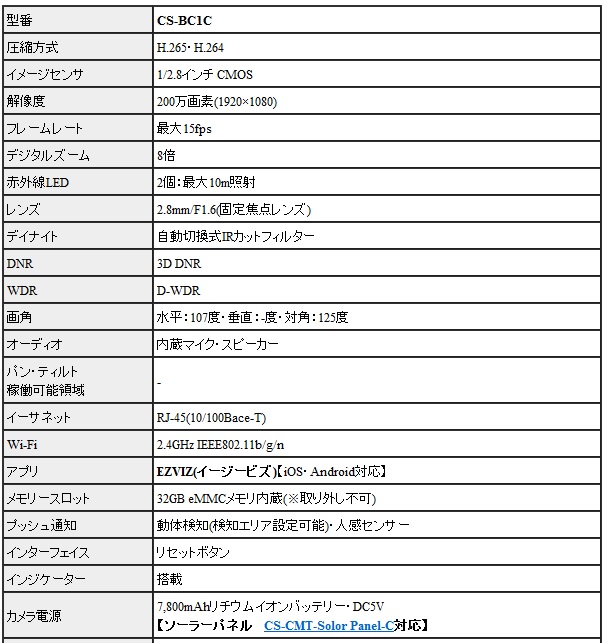 ![]() CS-BC1C (eLife)は、H.265方式を採用した屋外設置対応 32GB eMMCメモリ搭載大容量バッテリー内蔵 200万画素Wi-Fiネットワークカメラです。 【姉妹品に、カメラ1台セットモデル CS-BC1-B1(カメラ1台) カメラ2台セットモデル CS-BC1-B2(カメラ2台) カメラ3台セットモデル CS-BC1-B3(カメラ3台)もございます】 世界第1位の防犯カメラメーカー Hikvision (ハイクビジョン)社グループのコンシューマ向けブランド EZVIZ(イージービズ)ブランドの製品となっております。 ●1回の充電で最長1年間の利用が可能な大容量バッテリー搭載 CS-BC1Cはカメラ部には、大容量7,800mAh リチウムイオンバッテリーを搭載。 1回のフル充電で従来機種より、長い期間ご利用いただけます。 オプションのソーラーパネル CS-CMT-Solor Panel-Cと 組み合わせて使用することで、電池切れのリスクを 更に減らすことも可能です。 ●広角撮影に対応する固定焦点レンズ採用 搭載するレンズは、明るい固定焦点レンズを搭載しています。 対角125度の広角仕様となっておりますので ご自宅の玄関・マンションの入り口等への設置に 最適な製品となっております。 8倍のデジタルズームを搭載しておりますので 1台で広角から、ズームアップまで対応します。 ●天井・壁面の両方に対応した取付ブラケット CS-BC1Cに装着されているブラケットは、天井・壁面 2つの取付方法に対応します。 設置する環境に合わせて、お好みの撮影アングルになる方へ 取付てご利用いただけます。 また、ブラケットはマグネットベースを使った バリアブルアングルタイプと、1/4-20UNCネジ採用 ブラケットヘッドタイプの2つのパーツが付属します。 カメラ接地面には、磁気ベースを採用しております。 磁石がつく素材の環境では、インストール作業がより簡単に行えます。 (姉妹品に、31W×31Hサイズ2,000mAHバッテリー搭載 屋内用コンパクトモデル CS-BC2もございます) ●屋外設置を可能にしたIP66構造 CS-BC1Cは、屋内入り口等への設置はもちろんのこと 屋外設置にも対応。 ご自宅の駐車場監視、自宅敷地内へ立ち入る人の録画等にも ご活用いただけます。 ●双方向通話に対応するマイク・スピーカー内蔵モデル CS-BC1Cは、本体前面に集音マイク・底面にスピーカーを搭載。 ライブ映像確認時の音声マイクとしても、録画データ保存時にも 映像と音声を一緒に記録する事が可能です。 (※マイク機能は、オフにして利用する事も可能) スピーカーも搭載しておりますので、家族と会話を行ったり 不審者に対して、警告を行う事もできます。 ●警告音・音声メッセージによる警告機能 CS-BC1Cは、デフォルトの警告音によるアラートのほかに 侵入を制止したり、訪問者に挨拶をしたりするために 10秒間の音声メッセージを録音することが可能。 本機能により、工夫次第で防犯カメラ・見守りカメラとしての 用途が更に拡げることができます。 ●侵入者対策用アラーム警告機能 CS-BC1Cは、侵入者を検知すると105dBのアラーム音を鳴らして 2個のストロボライトを点滅させて、警告を行えます。 侵入者に対して、敷地内に入らないように抑止力を与える事が可能です。 ●人物・車両の動きに応じた録画をするAIディープラーニング機能 CS-BC1Cは、組み込み済のディープラーニングモデルにより リアルタイムで人・車両の形をした動きを検知します。 そのため、検知エリア内に人・車両が侵入すると精度の高い 検出を行い、必要な場合のみプッシュ通知を行います。 ●フルハイビジョンサイズ動画・静止画撮影対応 動画・静止画共に1920×1080(1080p)の録画・撮影が可能。 動画撮影時は、音声記録にも対応します。 ●32GB eMMCメモリ内蔵 CS-BC1Cは、32GBのeMMCメモリを内蔵しておりますので 別途、録画用カードを用意する必要はございません。 動画・静止画は、内蔵のメモリに記録ができます。 メモリ内に記録された動画・静止画データは、スマホで接続して アプリ側に保存することも可能です。 ●クラウドストレージ対応(有料) メモリーカード録画以外に、有料のクラウドストレージを使用した 録画にも対応しております。(EZVIZクラウド) ご希望の方は、アプリ内のクラウドストレージ ご契約画面より、ご希望のプランをお選びいただきご契約ください。 【アクティベーションカードタイプ 選べる4つのプラン CloudPlay(7日保存・1ヶ月プラン)等もございます】 ●わかりやすい日本語化アプリ 使用するアプリ、【EZVIZ(イージービズ)】は 日本語化されており、わかりやすいデザインです。 はじめての方にも、やさしい画面となっております。 ●赤外線LED2個搭載 最大照射距離10Mに対応した、可視光タイプ赤外線LED2個搭載。 明るい時はカラー映像、暗くなったらLED光を照射して 高感度モノクロ映像で撮影します。 ●夜間のカラー撮影に対応するカラーナイトビジョン機能 CS-BC1Cは、F1.6の大口径レンズを搭載しておりますので 薄暗い場所でも、従来機種に比べてクリアに映像を映し出します。 搭載されているカラーナイトビジョン機能は、内蔵さ