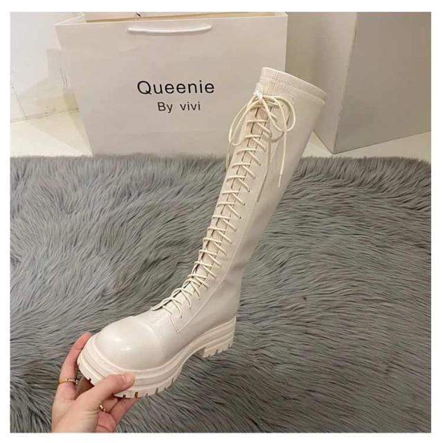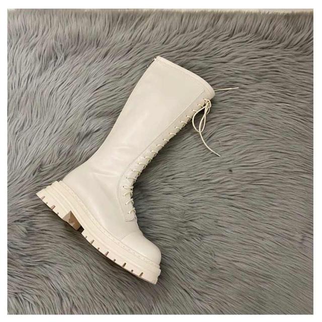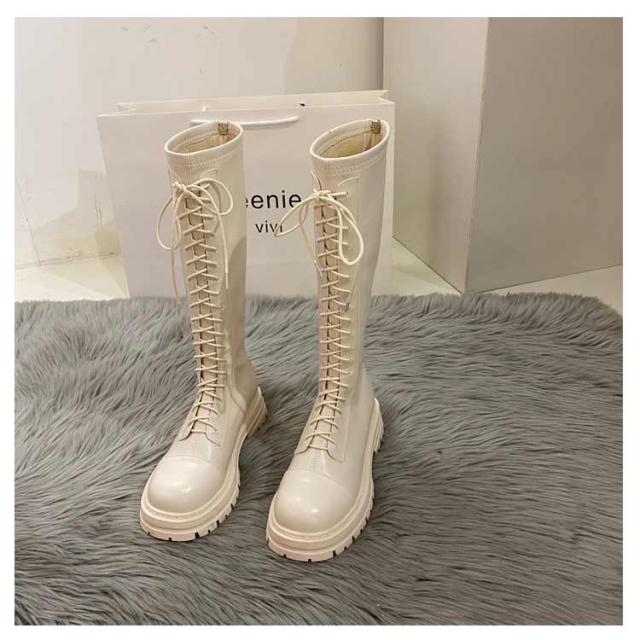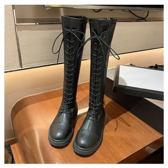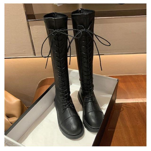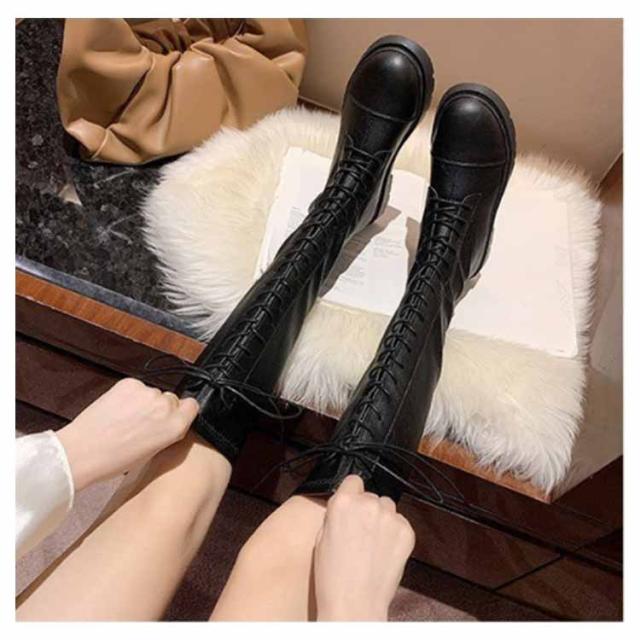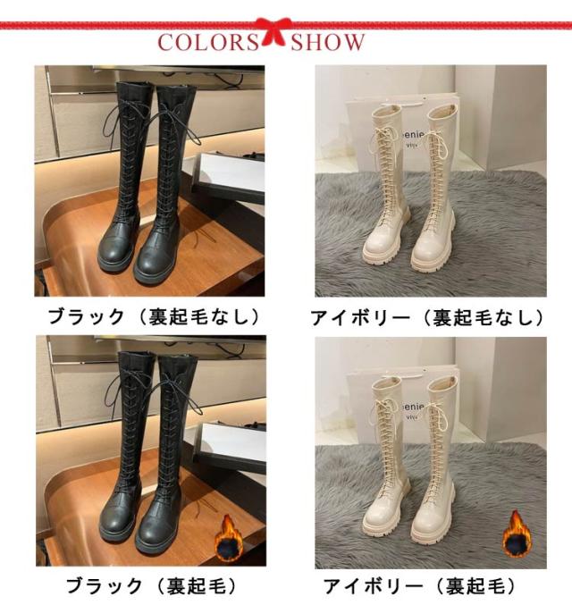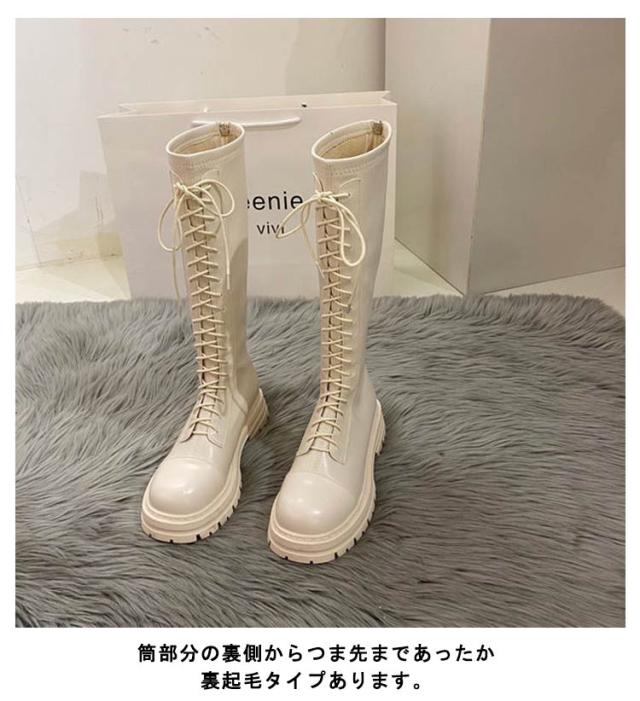 ロングブーツ レースアップ 裏起毛と裏起毛なし2タイプ レディース コンバットブーツ バックファスナー フラット底 ラウンドトゥ 編み上げ 細見え 足長効果 春 秋 冬 あたっか 撥水 防水 軽量 pu 革ブーツ 防寒 保温