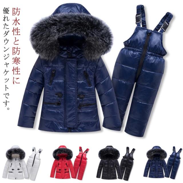 ダウン キッズ ダウンジャケット 2点セット ダウンコート+ダウンサロペット ベビー服 上下セット 女の子 男の子 無地 フード付き 子供服 アウター ラクーンファー付き アウトドア キッズジャケット 雪遊び 防寒 お出かけ 防寒 冬 90 100 110 120
