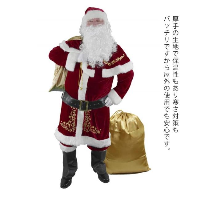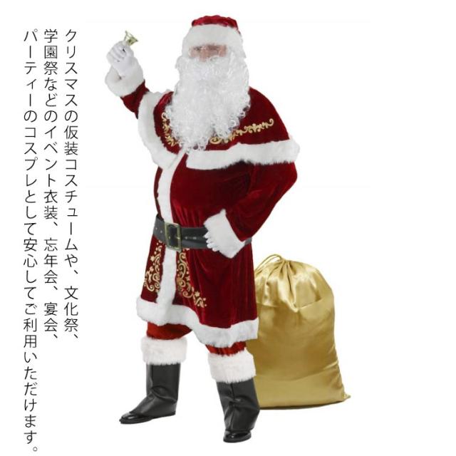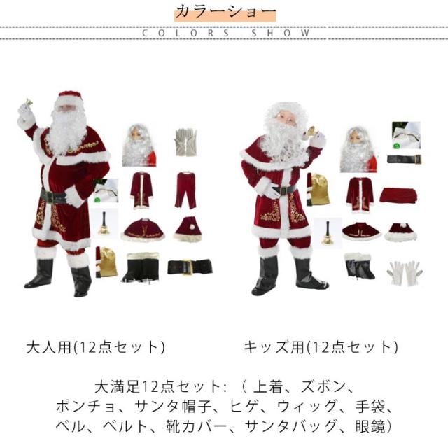 | 豪華12点セット!親子ペアで着れるサンタコスプレ衣装。 大満足12点セット: ( 上着、ズボン、ポンチョ、サンタ帽子、ヒゲ、ウィッグ、手袋、ベル、ベルト、靴カバー、サンタバッグ、眼鏡) 厚手の生地で保温性もあり寒さ対策もバッチリですから屋外の使用でも安心です。 クリスマスの仮装コスチュームや、文化祭、学園祭などのイベント衣装、忘年会、宴会、パーティーのコスプレとして安心してご利用いただけます。 大人・キッズサイズがあるので、家族でおそろいにできます。 | |