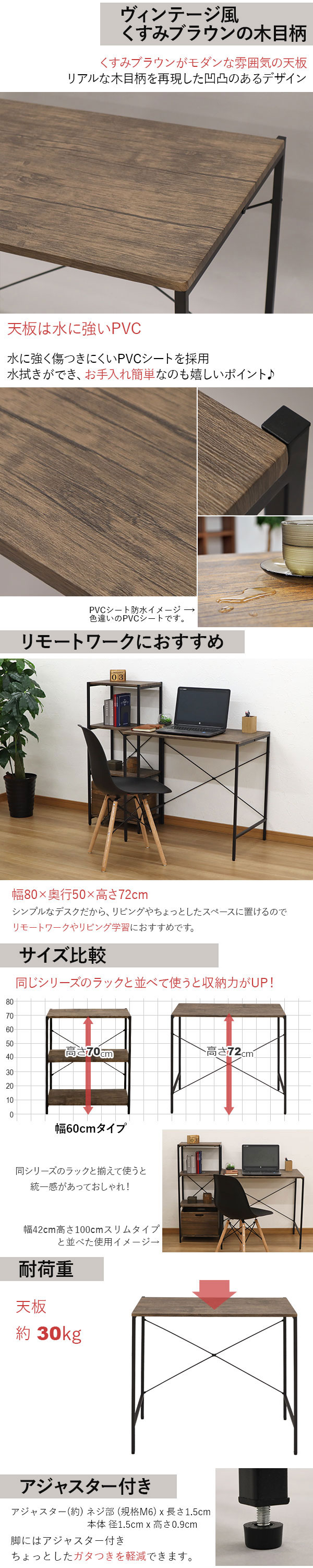 デスク 机 パソコンデスク 幅80cm 奥行50cm 高さ72cm おしゃれ ワークデスク 80cm幅 シンプル PCデスク キッチン 作業机 学習机 勉強机 ゴミ箱上 作業台 ワークテーブル 作業テーブル テレワーク ヴィンテージ風 くすみカラー ブラック 黒 アイアンフレーム ブラウン 木目調