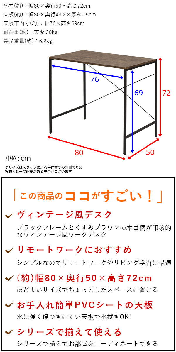 商品名:デスク 机 パソコンデスク 幅80cm 奥行50cm 高さ72cm おしゃれ ワークデスク 80cm幅 シンプル PCデスク キッチン 作業机 学習机 勉強机 ゴミ箱上 作業台 ワークテーブル 作業テーブル テレワーク ヴィンテージ風 くすみカラー ブラック 黒 アイアンフレーム ブラウン 木目調