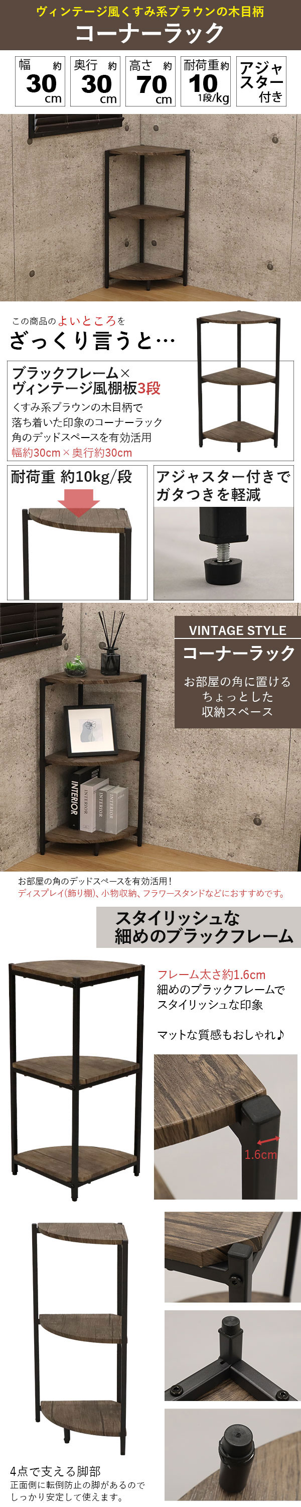 コーナーラック 3段 ラック 幅30cm 奥行30cm 高さ70cm おしゃれ スリム 角 収納 スチール リビング 玄関 トイレ 洗面所 コンパクト フラワースタンド 観葉植物 花瓶 飾り棚 ディスプレイラック ヴィンテージ風 くすみカラー シンプル ブラック 黒 アイアンフレーム ブラウン