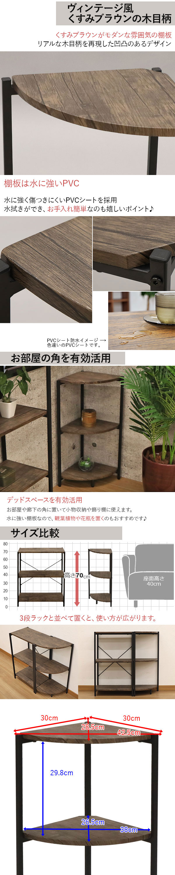 ヴィンテージ風くすみ系ブラウンの木目柄 コーナーラック の説明