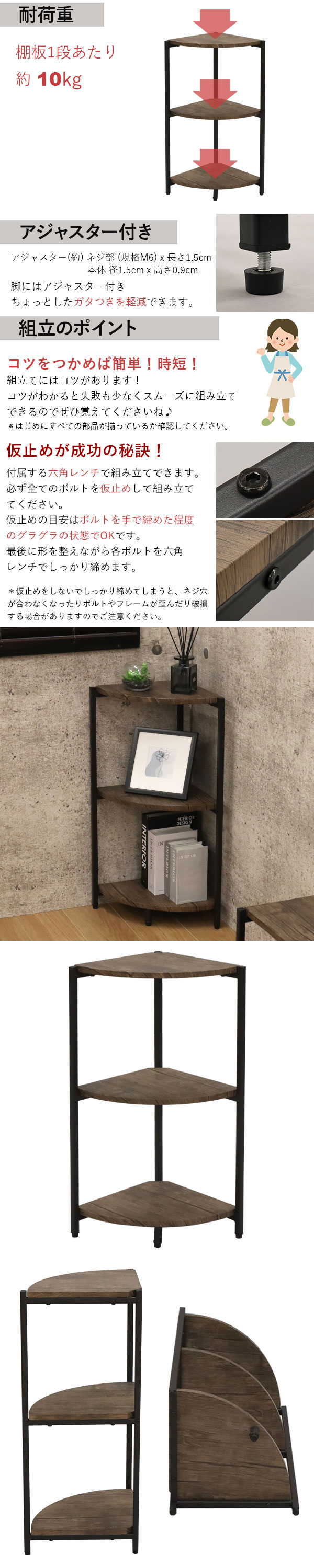 - 組み立てはシンプルで女一人でもサクッとできました。 傷も特にありませんでした。 階段のコーナーに設置しましたが、ごちゃごちゃしていたものが一気に片付いて、高さも高過ぎないので安心です。 買って良か...