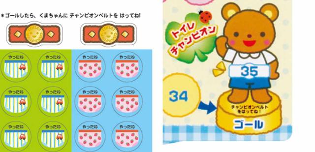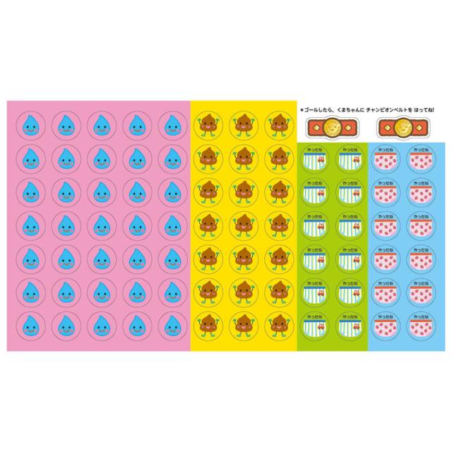 トイレを知らせたり、上手にできたらシールを貼りましょう。シールを貼る楽しみや達成感がお子さまのトイレ習慣を自然と身に付けます。ゴールにはチャンピオンベルトのシールを貼って、お子さまを褒めてあげてください。「自分でできた」という自信が自立する力を育てます。