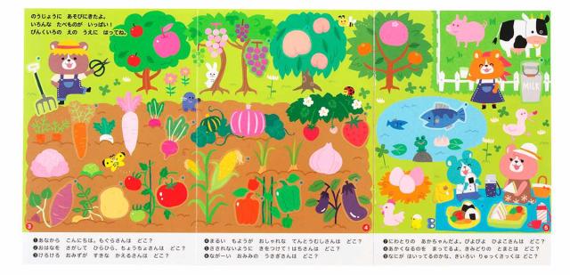 一場面がパノラマページになるので、広い面でたくさん遊べます。農場とキッチンの場面でシール遊びを楽しめます。