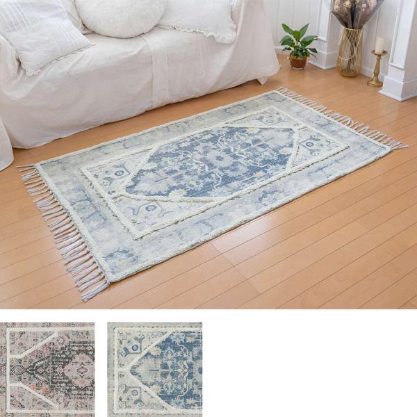 ラグアンティーク調の絨毯をイメージ 異国の地でふと立ち寄ったアンティークショップ。 足元を見ると、何年も使い込まれているのに素敵な雰囲気漂う絨毯・・・。 そんなイメージからデザインされたラグマットです。くすみカラーは木彫の家具とも相性◎。 プリントとタフティングでデコレーションをしました。