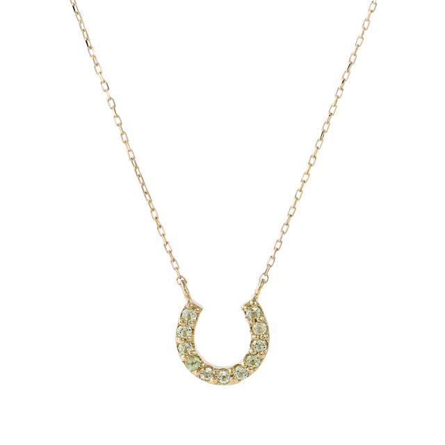 8月の誕生石でもあるペリドットを、幸せをキャッチすると古くから言い伝えのある馬蹄デザインのネックレストップにしました。
