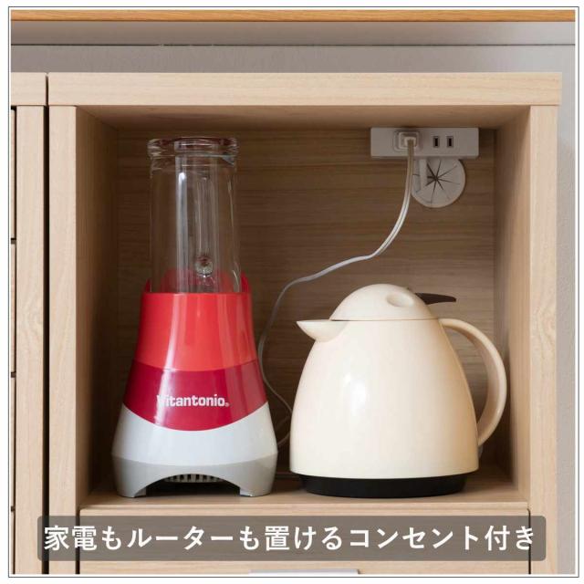 オープンスペースには2口コンセントがあるので、ミキサーやポットなどの家電はもちろん、ルーターや充電器の収納にも便利です。