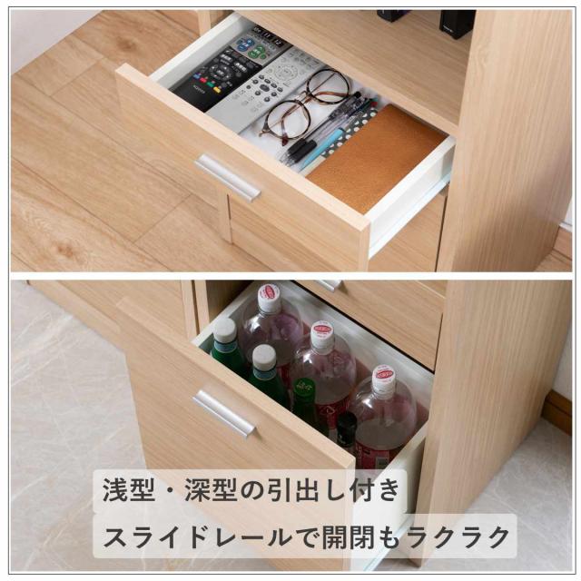 オープンスペースの下には、浅型と深型の引出し2杯を備えており、小物類をスッキリ整理できます。深型の引出しは2Lペットボトルが収納できる深さがあり、ストック置きにもぴったりです。さらにスライドレール付きで、開閉もスムーズに行えます。