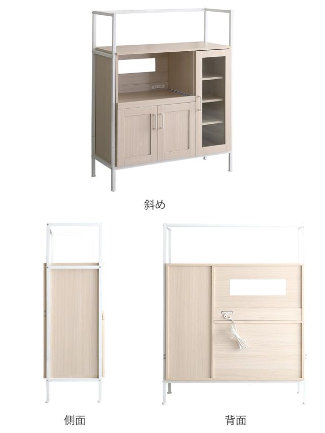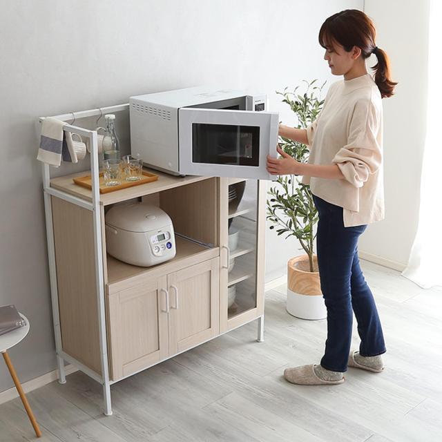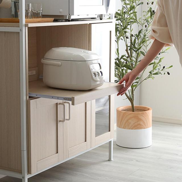 ナチュラルで爽やかな印象のレンジ台です。充実の収納力で食器はもちろん、炊飯器やレンジがコンパクトに収まり省スペースでお使いいただけます。明るい色調でキッチンをお洒落な空間に演出してくれるデザインです。