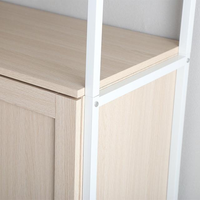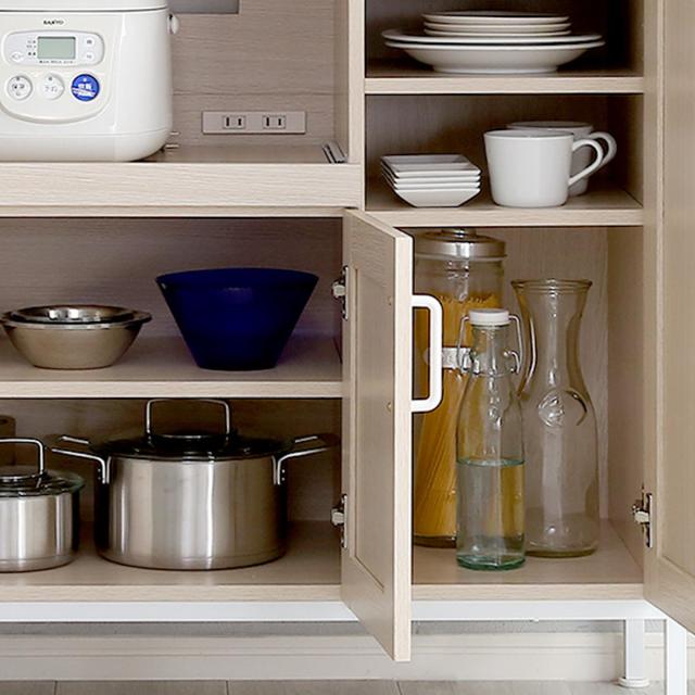 明るい木目と白いフレームが、キッチンに軽やかな雰囲気をもたらしてくれます。フレーム構造なので圧迫感を感じさせず、空間にすっきりと馴染みます。