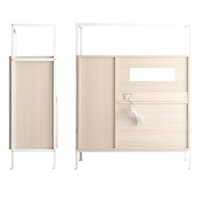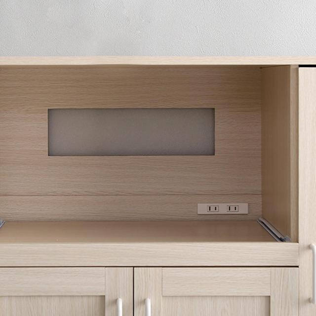背板には通気穴付きなので炊飯器や湯沸かしポットの熱や蒸気がこもりにくいです。また、計1500Wの2口コンセント付きです。