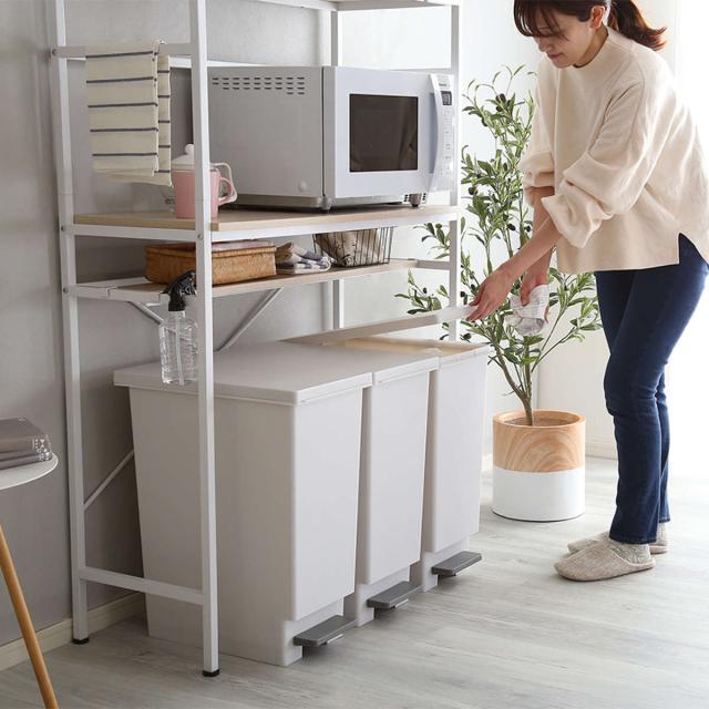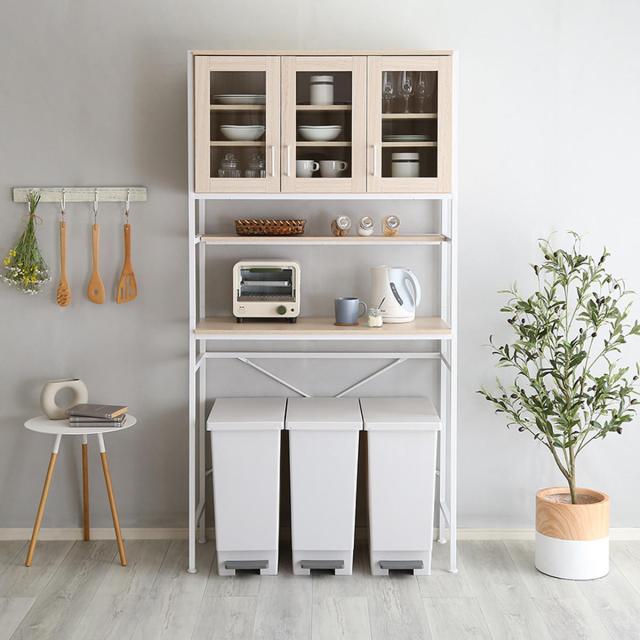 ナチュラルで爽やかな印象のゴミ箱上ラックです。ごみ箱上の空いた空間を活用して食器やキッチン家電をまとめて収納できます。明るい色調でキッチンをお洒落な空間に演出してくれるデザインです。