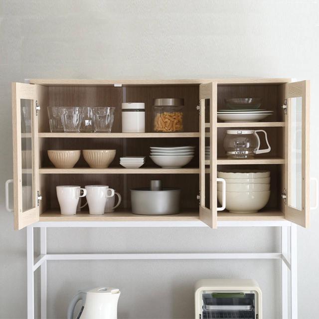 丈夫で安心な強化ガラスを採用しており、すぐに使うものや、お気に入りの食器や小物などの収納におすすめです。左側に両開き、右側に片開きの扉が設けられており、食器の大きさによって使い分けができます。また、可動棚なので収納する物に合わせて調節できるので無駄なく収納していただけます。