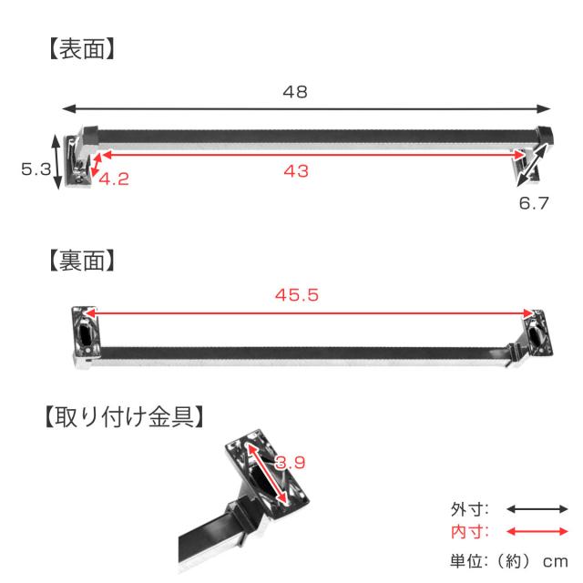 | サイズ | 約 幅48×奥行6.7×高さ5.3(cm) 角パイプ径:1.6(cm) ねじ穴間隔:45.5(cm) |