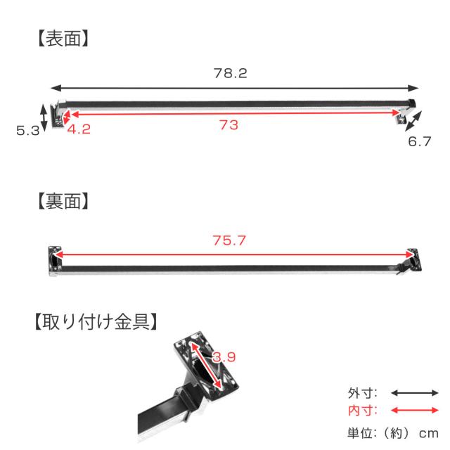 | サイズ | 約 幅78.2×奥行6.7×高さ5.3(cm) 角パイプ径:1.6(cm) ねじ穴間隔:75.7(cm) |