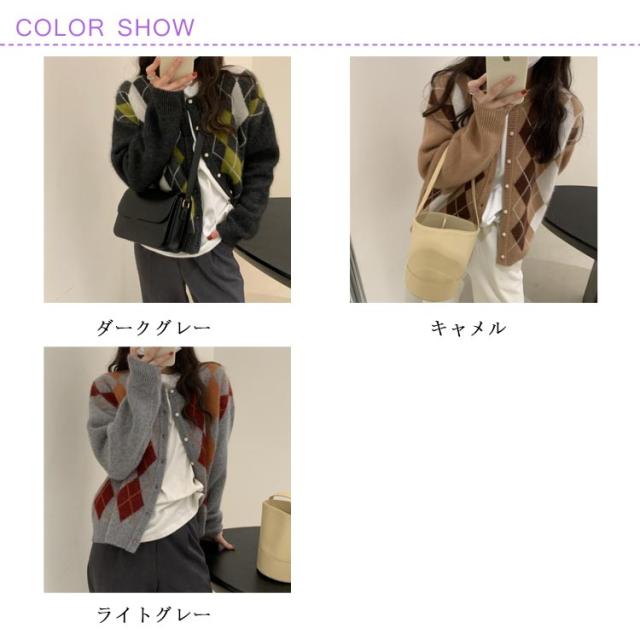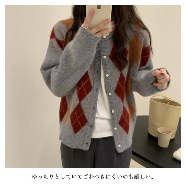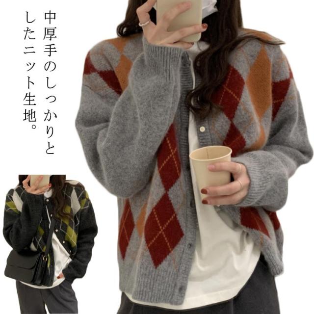 アーガイル チェック柄 ざっくりカーディガン チェック ニット カーディガン カーディガン 秋 冬 レディース アーガイルチェック 長袖 おしゃれ カジュアル 新作!アーガイル