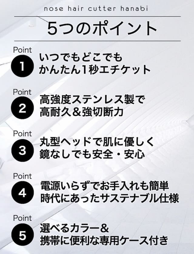 『hanabi』は電源いらずのエコで安全・安心でコンパクトな新世代の鼻毛カッターです。