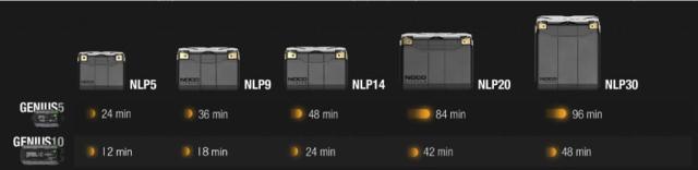 上記は100%放電した状態からNOCO GENIUS( ジーニアス)5 、GENIUS10 を使用し、完全に充電した場合の所要時間の目安です。