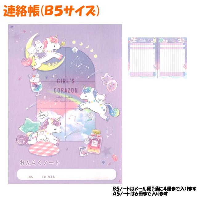 メール便 OK 連絡帳 連絡ノート B5 サイズ 女の子 向け ガールズコラゾン ユニコーン クーリア おしゃれ で かわいい 文房具