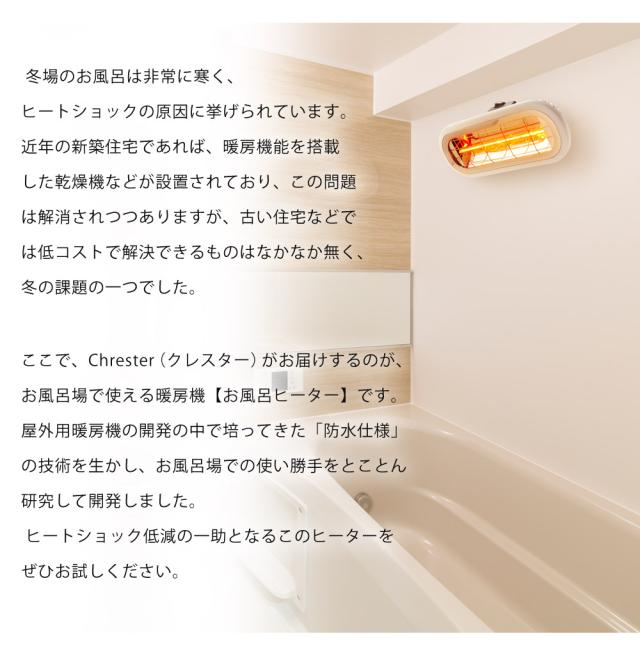ここで、Chrester(クレスター)がお届けするのが、お風呂場で使える暖房機【お風呂ヒーター】です。