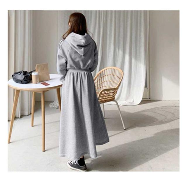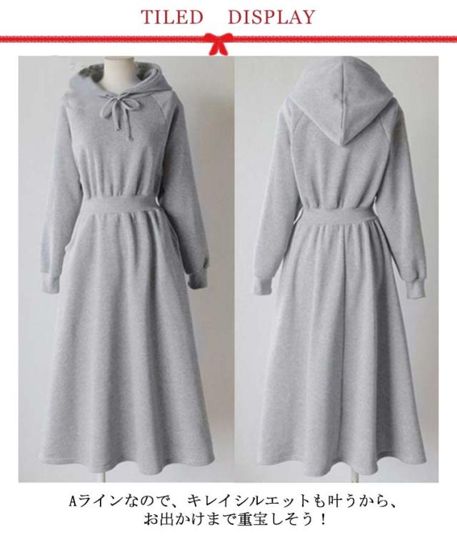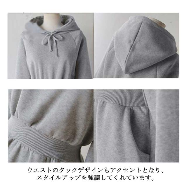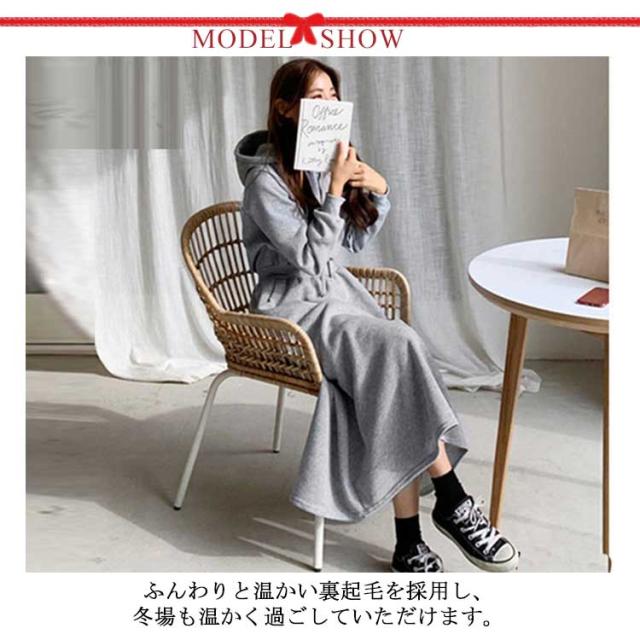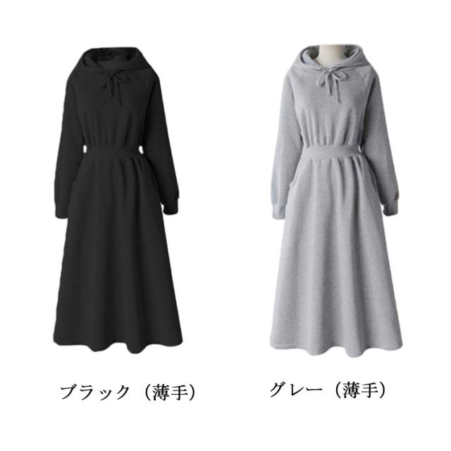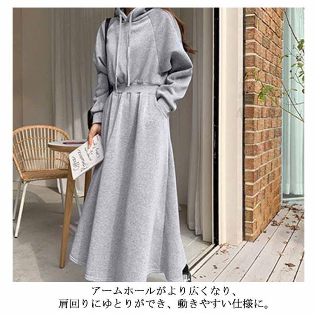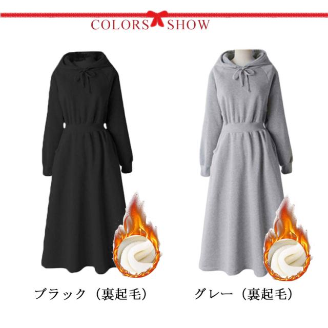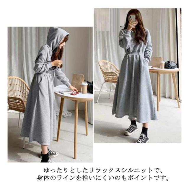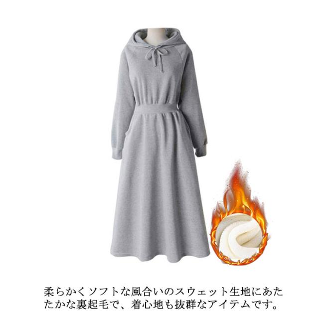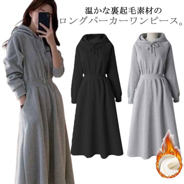 裏起毛 ワンピース 秋 冬 ロング 長袖 パーカーワンピース スウェットワンピース aライン フレア ワンピ 着痩せ きれいめ タック入り 大きいサイズ 厚手 フード付き ポケット付き フーディー パーカー ワンピ カジュアル 【送料無料】