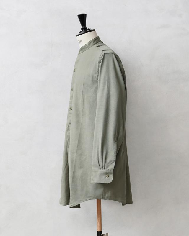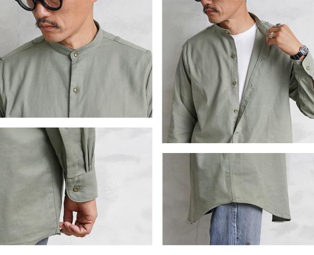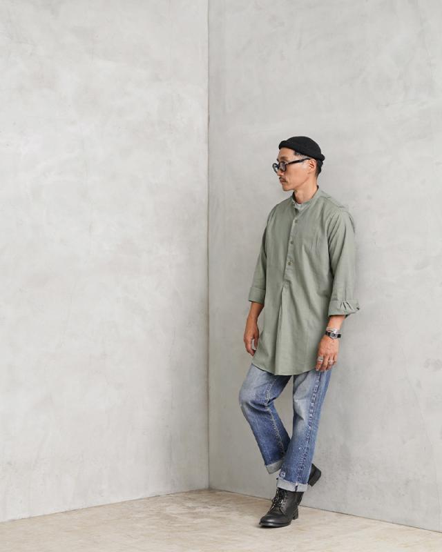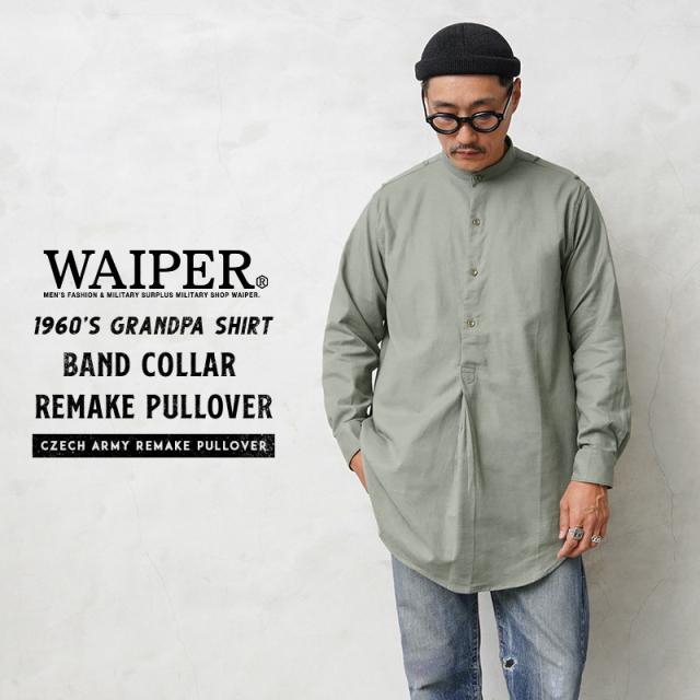 1960年代の希少なチェコ軍実物放出のプルオーバー グランパシャツをWAIPERがバンドカラーシャツにリメイクしました!襟周りをバンドカラーに変更することでクラシックな風合いに上品な雰囲気のあるこなれた印象の着こなしを楽しめます。