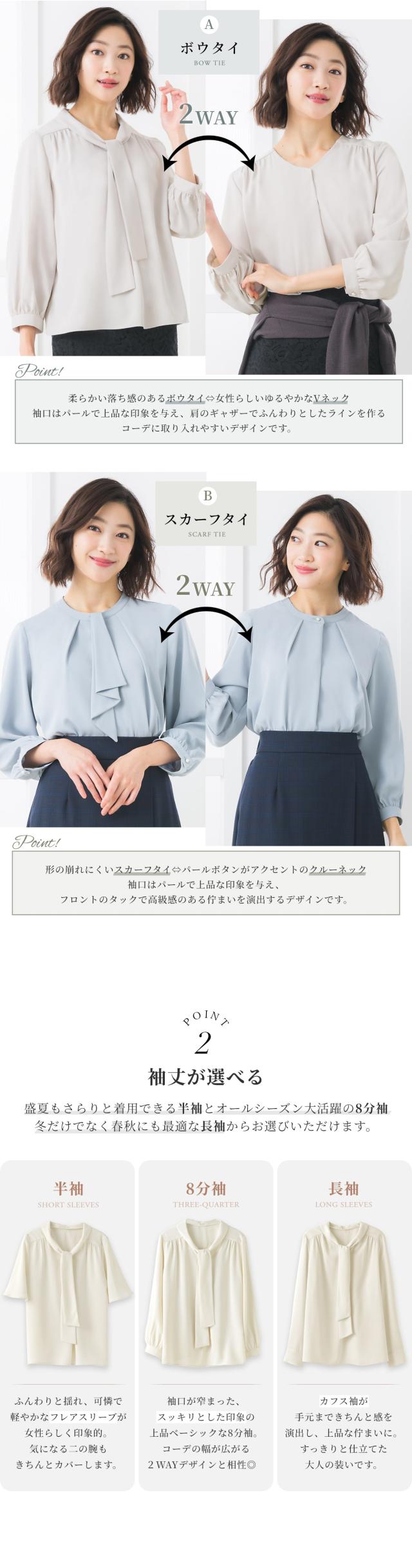 2種類からお選びいただける、上品さと実用性を兼ね備えた2WAYタイ付きブラウス