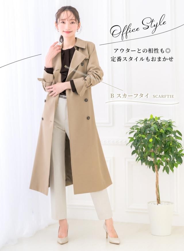 2デザインからお選びいただける、上品さと実用性を兼ね備えた2WAYタイ付きブラウス タイはボタンで簡単に取り外しが可能で、2つの異なるデザインを楽しめます。 袖丈は、盛夏に快適な半袖、オールシーズン活躍する8分袖、冬だけでなく春秋にも最適な長袖からお選びいただけます。 <ボウタイ> 若干の落ち感があるボウタイが、胸元で優雅に揺れ、女性らしいエレガンスを演出。 タイを外すと、シンプルで洗練されたVネックブラウスに変身。 控えめながらも大人の魅力を引き立てるデザインです。 <スカーフタイ> 形が崩れにくいスカーフタイは、どの角度から見ても可愛らしく、コーデの主役に。 タイを外すと、1粒のパールがアクセントになったクルーネックに早変わり。 華やかさとシンプルさを使い分けられるデザインです。 優れた素材でロングシーズン対応 さらっとした柔らかい肌触りの素材を使用。 シワになりにくく、程よいハリ感と毛玉になりにくい優秀素材。 上品な見た目をキープしながら、扱いやすさも魅力です。 幅広いシーンで活躍 スーツに合わせるだけで華やかに見え、オフィスやデイリーはもちろん、フォーマルシーンにも最適。 1着で2度楽しめる2WAYブラウスで、気分に合わせた着こなしを。 |