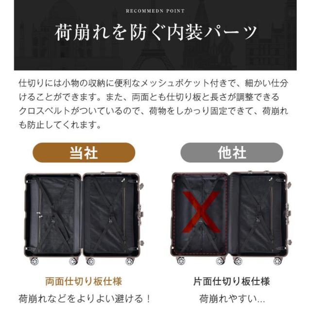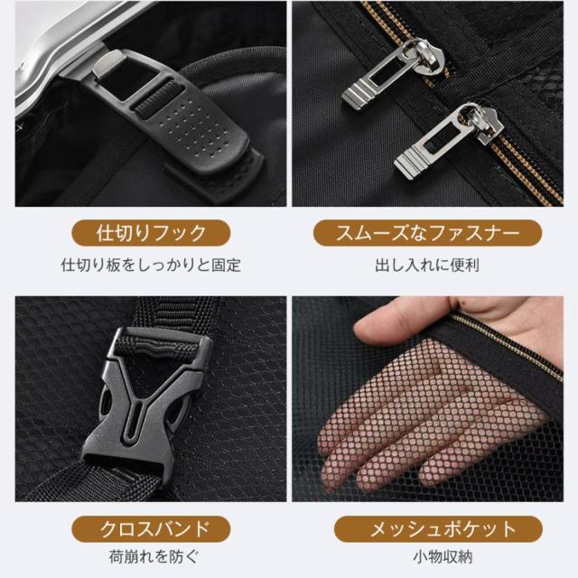 【荷崩れを防ぐ内装パーツ】中には凸凹がありますが、容量を重視している人は、ケースサイズいっぱいまで、荷物を詰め込むことが可能です。また、仕切りには小物の収納に便利なメッシュポケットつきで、細か仕分けることができます。その他、長さが調整できるクロスベルトも付いているので、荷物をしっかり固定できて、荷崩れを防止してくれます。