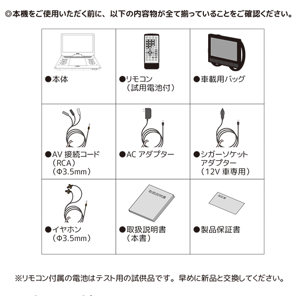 本体 ・ リモコン (試用電池付) ・ AC アダプター ・ AV ケーブル・ 車載用 DC シガーアダプター ・ 車載用バッグ ・ イヤホン・ 取扱説明書 ・ 保証書