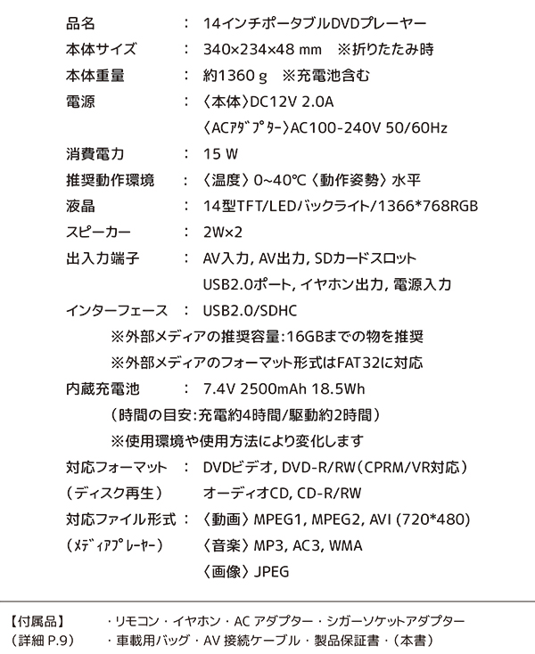 | 商品説明 | ・多軸回転型モニター 液晶モニターをお好みの角度に調節可能 ・CPRM/VRモード対応 地デジ番組を録画したDVDディスクもOK ・レジューム再生機能 前回停止した位置より続き再生が可能 ・USBメモリ/SDカード対応 メモリデバイス内の画像・音声データの再生が可能 ・音楽CDリッピング録音機能 音楽CDを外部メモリーにダイレクト録音 ・AV(RCA)入力&出力端子 RCA端子(赤・黄・白)で外部機器と接続もOK 【サイズ】 約355×255×48mm 【重量】 約1.5kg ※折りたたみ時 【付属品】 本体 ・ リモコン (試用電池付) ・ AC アダプター ・ AV ケーブル・ 車載用 DC シガーアダプター ・ 車載用バッグ ・ イヤホン・ 取扱説明書 ・ 保証書 規格 ■生産地:中国 ■素材・成分:【電源】 本体: DC12V 2.0A ACアダプター:100~240V 50/60Hz 【消費電力】 約 15W 【液晶】 14V 型 TFT/LED バックライト /1366*768RGB 【スピーカー】 2W×2 【推奨動作環境】 温度:0 ~ 40°C 動作姿勢:水平 【出入力端子】 AV 入力 , AV 出力 , USB2.0 ポート ,SD カードスロット , イヤホン出力 【インターフェース】 USB2.0/SDHC (推奨容量 ~16GB) 【内蔵充電池】 Li-PO 7.4V 2000mAh 14.8Wh (充電/駆動時間の目安 : 充電約 4 時間/駆動約 2 時間) ※上記時間は目安です。 設置環境や使用方法等により変化します 【対応フォーマット(ディスク再生)】 DVD ビデオ ・ DVD-R/RW (CPRM/VR 対応)・オーディオ CD ・ CD-R/RW 【対応ファイル形式(メディアプレーヤー)】 動画:MPEG1,2 / AVI (720*480) 音楽: MP3 / AC3 / WMA 静止画:JPEG |