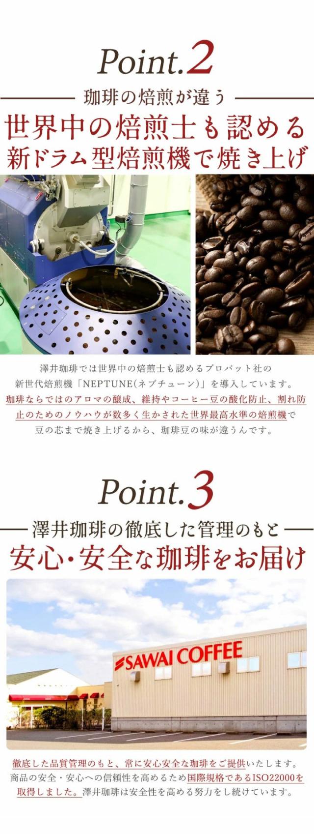 澤井珈琲(さわいこーひー)では、お客様のお家に商品が届き、箱を開けた瞬間。そして、トレードマークの赤いコーヒー袋の封を開けた時に鮮度抜群の「香り高さ」と、飲んだときの「味わい」に感動して頂けるように、レギュラーコーヒーはご注文を頂いてから焙煎をして焼きたてのコーヒー、コーヒー豆、珈琲、珈琲豆をお届けをしている焼き立て珈琲専門店です。お客様に「美味しい」と言って喜んで頂く事が私たちの喜びと思っております。「美味しいコーヒーをお届けしたい」と想い続けて生まれたこだわりの味を、どうぞ、この機会にお楽しみくださいませ。澤井珈琲では、コーヒー豆は挽き方がご選択いただけます。珈琲豆を挽く事をお楽しみ頂ける『豆のまま』や、私共の専用の特注サイズの大型のミルで挽いて、コーヒー粉の状態にしてお届けする方法がございます。中挽き、細挽き、粗挽き、荒挽きなど様々な挽き方がございますが、私共がお薦めする『店長のおすすめ挽き』にて、そのコーヒーに合った一番美味しいと思える挽き方に挽いてお届けします。東京の銀座にも実店舗を構える安心安全な澤井珈琲で楽しいお買い物をお楽しみください。よく間違えられる名前として、沢井珈琲、沢井コーヒー、澤井珈琲店、澤井珈琲本店、さわいこーひー、サワイコーヒーなどがございますが、正式名称は澤井珈琲となります。