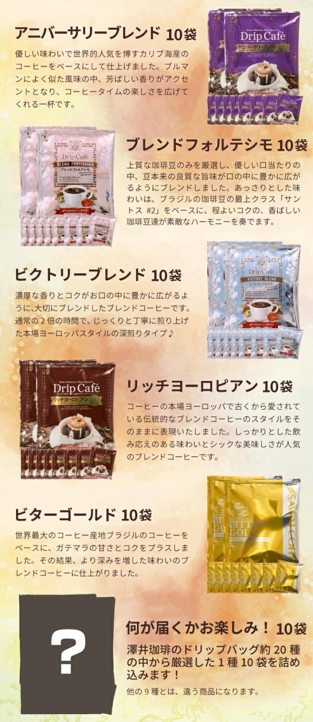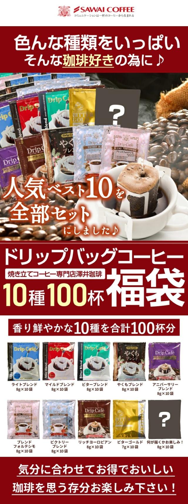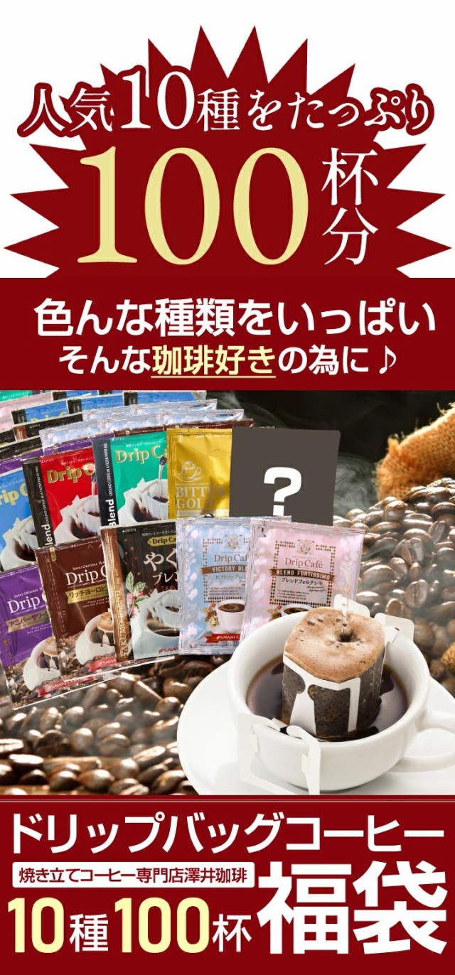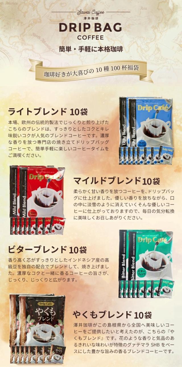 ドリップコーヒー コーヒー 100杯 ドリップ ドリップパック ドリップバッグ 100 珈琲 10種 100袋 おせち 個包装 8g 7g 大量 大容量 お徳用 澤井珈琲 福袋 ライト マイルド ビター やくも アニバーサリーブレンド お楽しみ