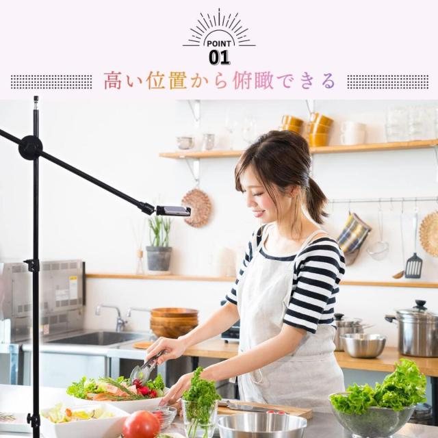 【サイズ】最大1.6m以上伸びる丁度良い高さに設定できる俯瞰用スマホスタンドです。スマホを固定して、長時間安定した撮影・録画が可能です。 最長 約160cm 最小約60cm (収納時 約55cm)です。調節するネジを回すことによって、最小から最長の長さの間でお好みの高さで止めることが可能です。(手作業による採寸のため、多少の誤差はご容赦願います。)