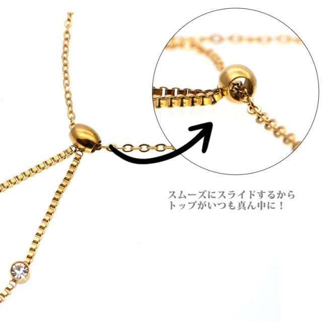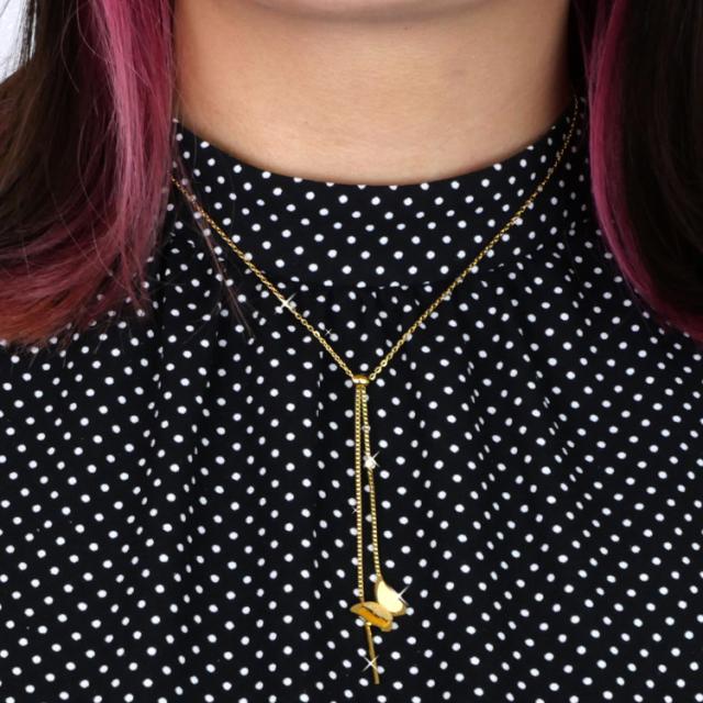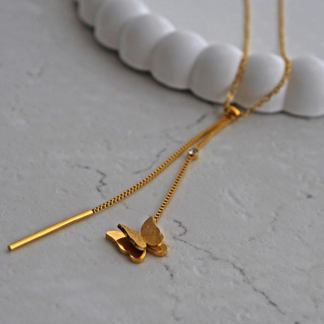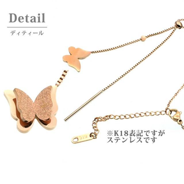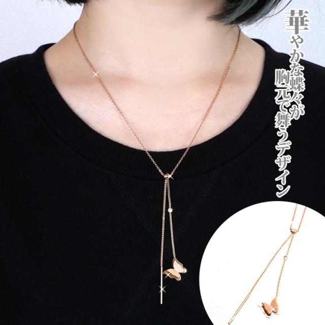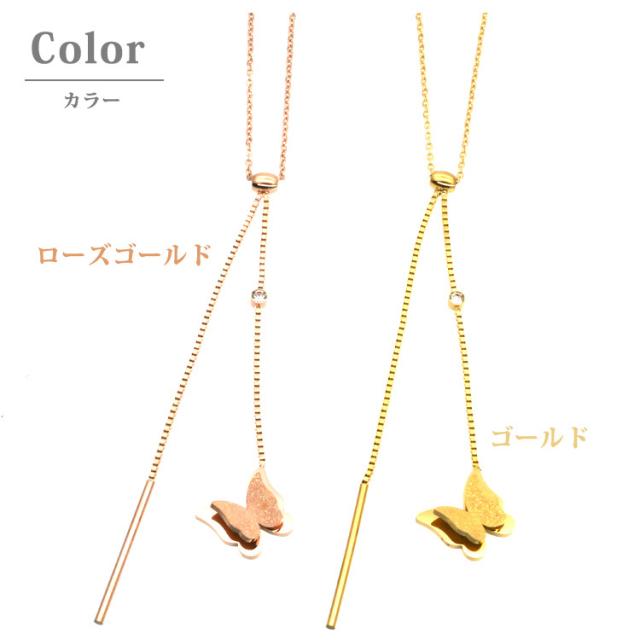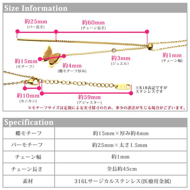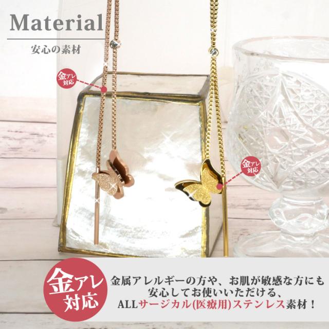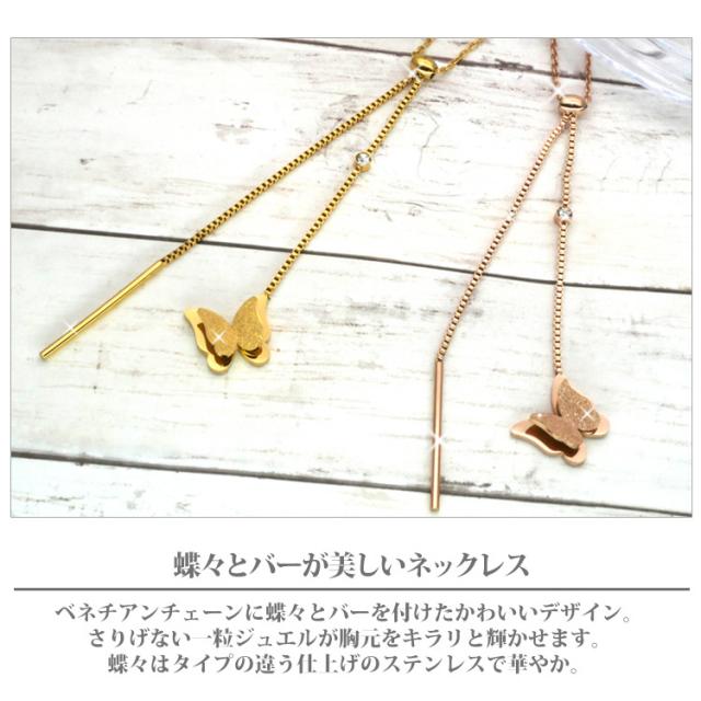 揺れる蝶々とバーがおしゃれな、肌に優しいステンレスネックレス。華やかなデザインが目を惹きます。 ネックレスチェーンの長さは45cm。素材には、金属アレルギーの方にも安心なサージカルステンレスを使用。シルバーやホワイトゴールド、プラチナで金属アレルギーが出てしまう方にもオススメです。