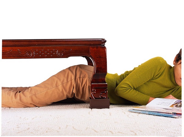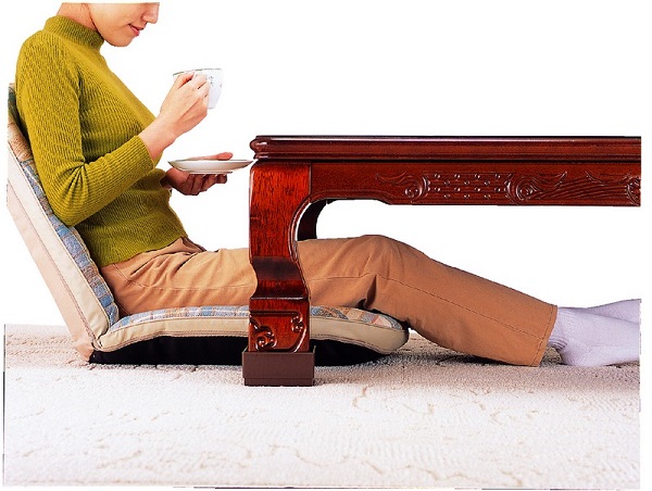 座卓またはこたつの各脚に本品をはめ込み、座卓やこたつの高さを上げると、寝転がっても腰が当たらず