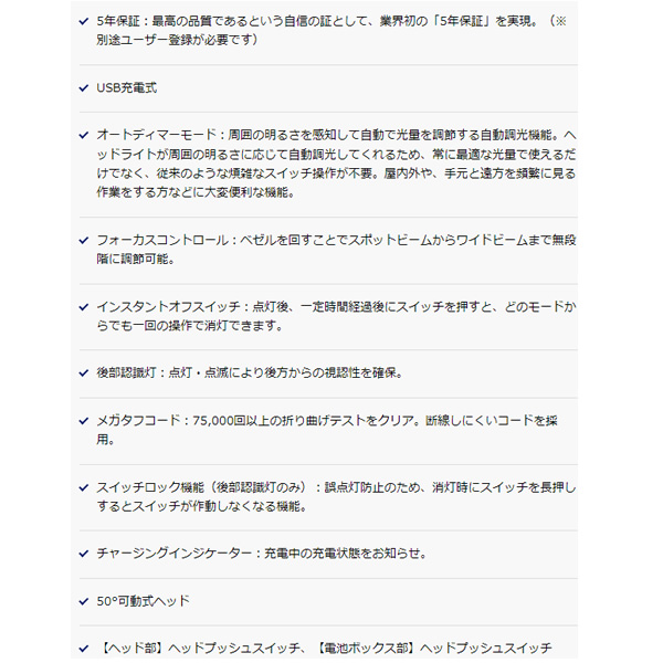 | 付属品 | すべり止め付きヘッドバンド、マグネットキャップ、専用充電池、専用マグネット充電ケーブル、Micro USBケーブル(50cm) 専用ACアダプター(5V/1A)、ヘルメットホルダー×4個 |