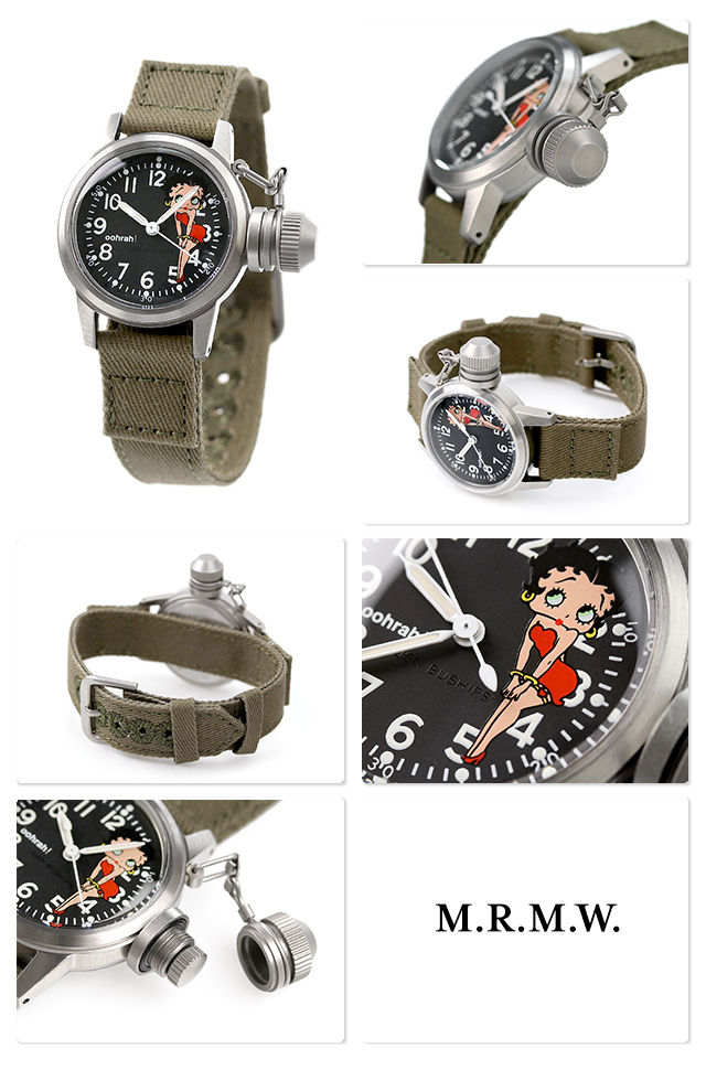 正規品 モントルロロイ ミリタリーウォッチ ブシップウオッチ ベティ・ブープ リミテッドバージョン クオーツ メンズ 腕時計 BSPS-E1-BET-FAB-GR M.R.M.W. BUSHIPS WATCH Betty Boop LIMITED VERSION アナログ ブラック カーキ 黒 ◆時計製作専門会社モントルロロイが、展開するミリタリーウオッチシリーズ。世界の名作ミリタリーウオッチを復刻。ミリタリーアイテムは普遍的でいつの時代も支持される、耐久性・使いやすさを追求した長年使える優れモノです。 飛行機の機首に描かれた絵(ノーズアート)を文字盤に再現したブシップウオッチ。ノーズアートとは軍隊で使われる飛行機(戦闘機や爆撃機)の主に機首(ノーズ)に描かれた絵やワードを示します。基本的に飛行機に描く”落書き”です。また、米海軍特殊部隊UDT水中爆破チームに供給された時計を復刻したミリタリーウォッチ。フロッグマンと呼ばれ、防水性を強化する為のリューズキャップが特徴的です。文字盤6時中央方向に "USN BUSHIPS" という文字が黒で描かれています。