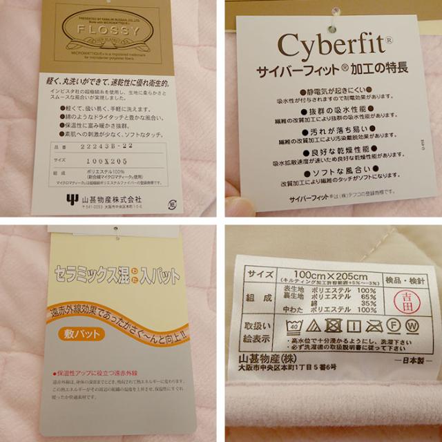 表生地:ポリエステル100%(マイクロマティーク・サイバーフィット加工) 裏生地:ポリエステル65%、綿35% 中わた:ポリエステル100%(セラミックス混わた/遠赤外線わた) |