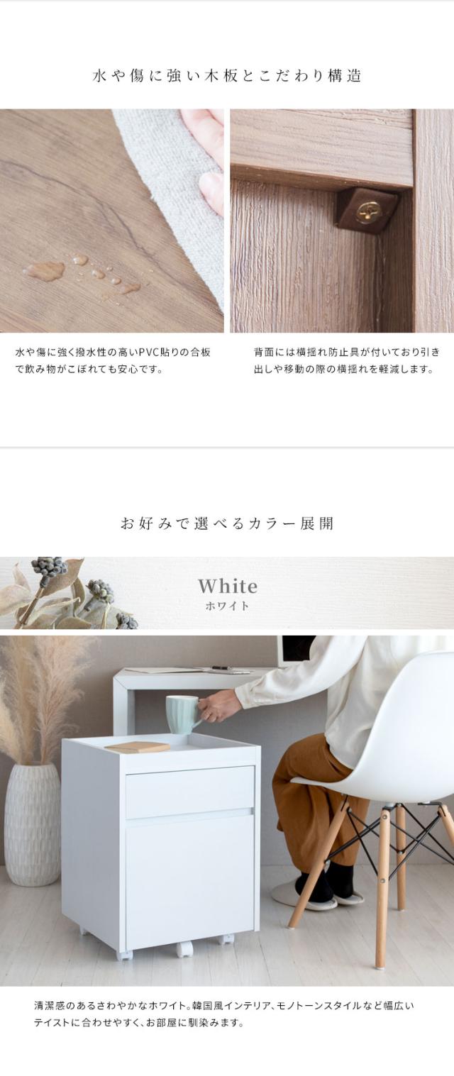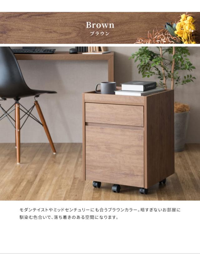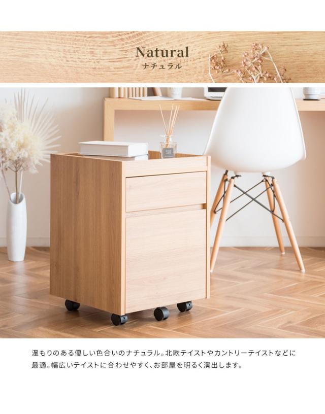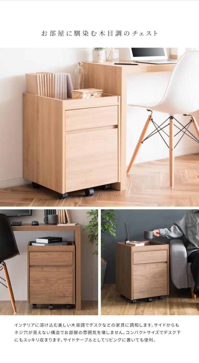 深さの異なる二つの引き出しはA4ファイルも収納できるサイズ。天板は囲いがあり書類やマグカップの落下を防げます。キャスター付きで移動もラクラク。